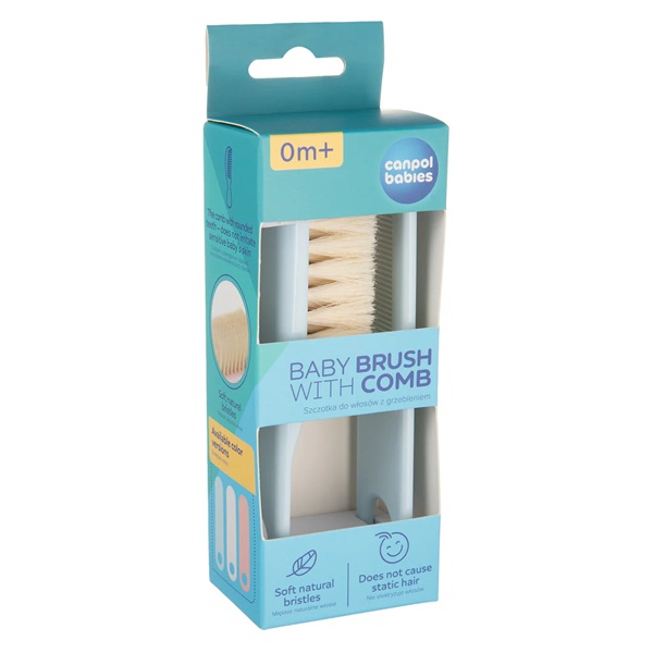 Set uključuje četku i češalj namijenjen njezi prvih bebinih pramenova od rođenja. Češalj ima zaobljene zupce koji ne iritiraju nežnu bebi kožu, dok četka sa sintetičkim čekinjama blago masira glavu i dotjeruje finu kosicu. Ergonomski oblikovane drške osiguravaju prijatan i siguran hvat, a poseban uložak u četki pomaže da se češalj uredno drži kada se ne koristi. Proizvod je izrađen od BPA‑free materijala i dostupan je u više pastelnih boja.