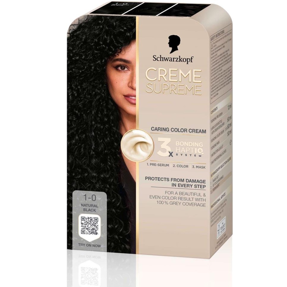 SCHWARZKOPF CREME SUPREME 1-0 PRIRODNO CRNA je visokokvalitetna boja za kosu koja pruža intenzivnu, dugotrajnu i prirodno crnu nijansu. Ova formula je posebno razvijena da obezbijedi potpunu pokrivenost sijedih vlasi, dok istovremeno njeguje kosu tokom procesa bojenja.