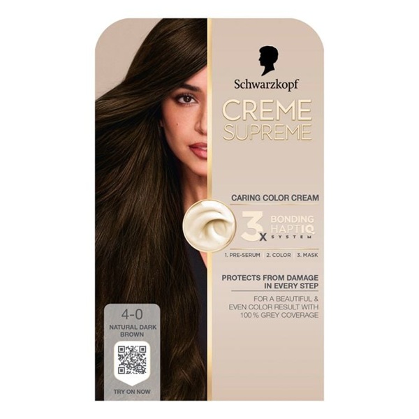 SCHWARZKOPF CREME SUPREME 4-0 PRIRODNO SMEĐA je kvalitetna trajna boja za kosu koja pruža bogatu, prirodnu smeđu nijansu uz 100% pokrivenost sijedih vlasi. Njena njegujuća formula sa uljima štiti i hidrira kosu tokom bojenja, ostavljajući je mekom, glatkom i punom sjaja.